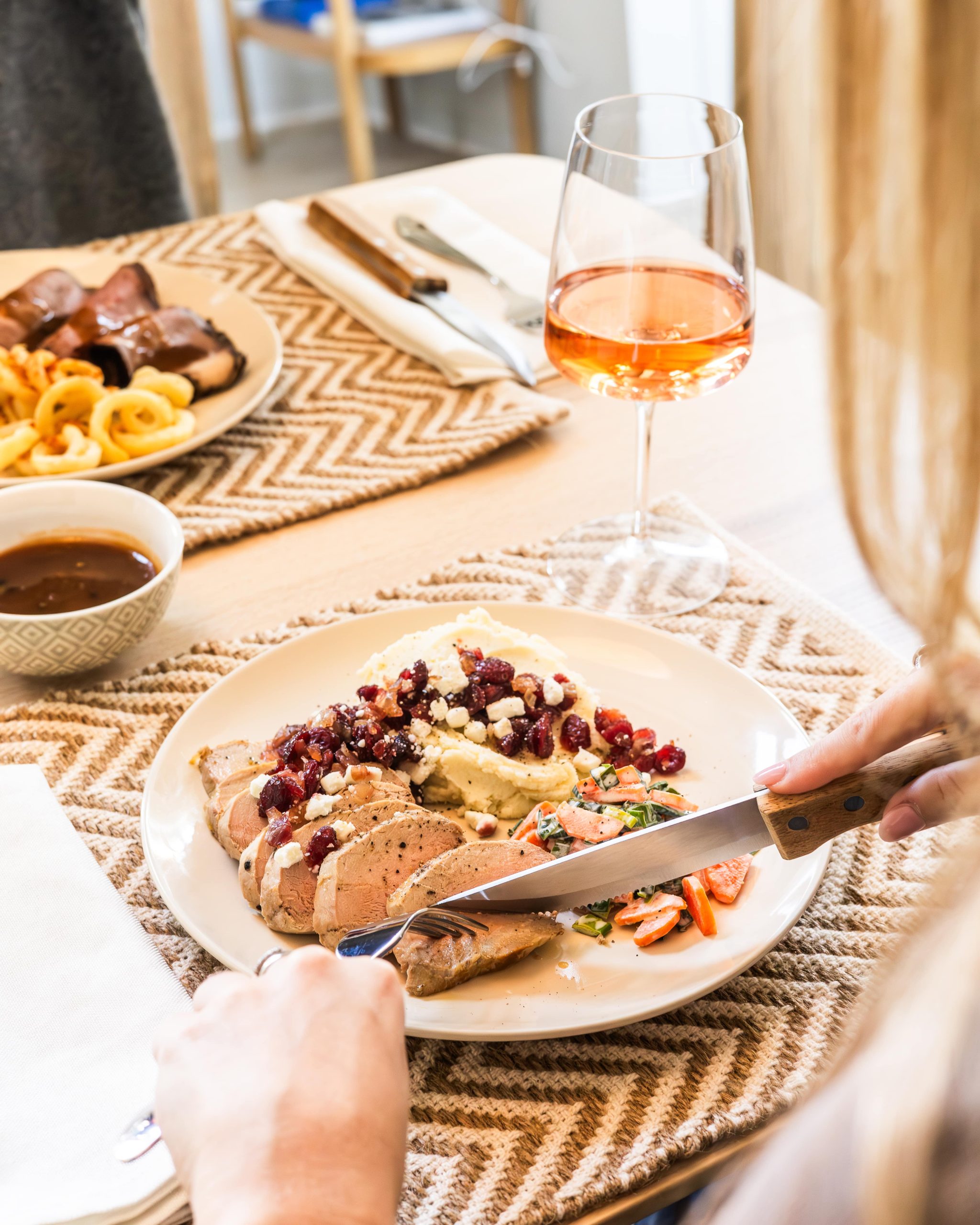 Filet de porc servie avec un mélange de canneberges séchées, oignons caramélisés, sirop d’érable et fromage de chèvre émietté (Peut être congelé cuit 3 mois)