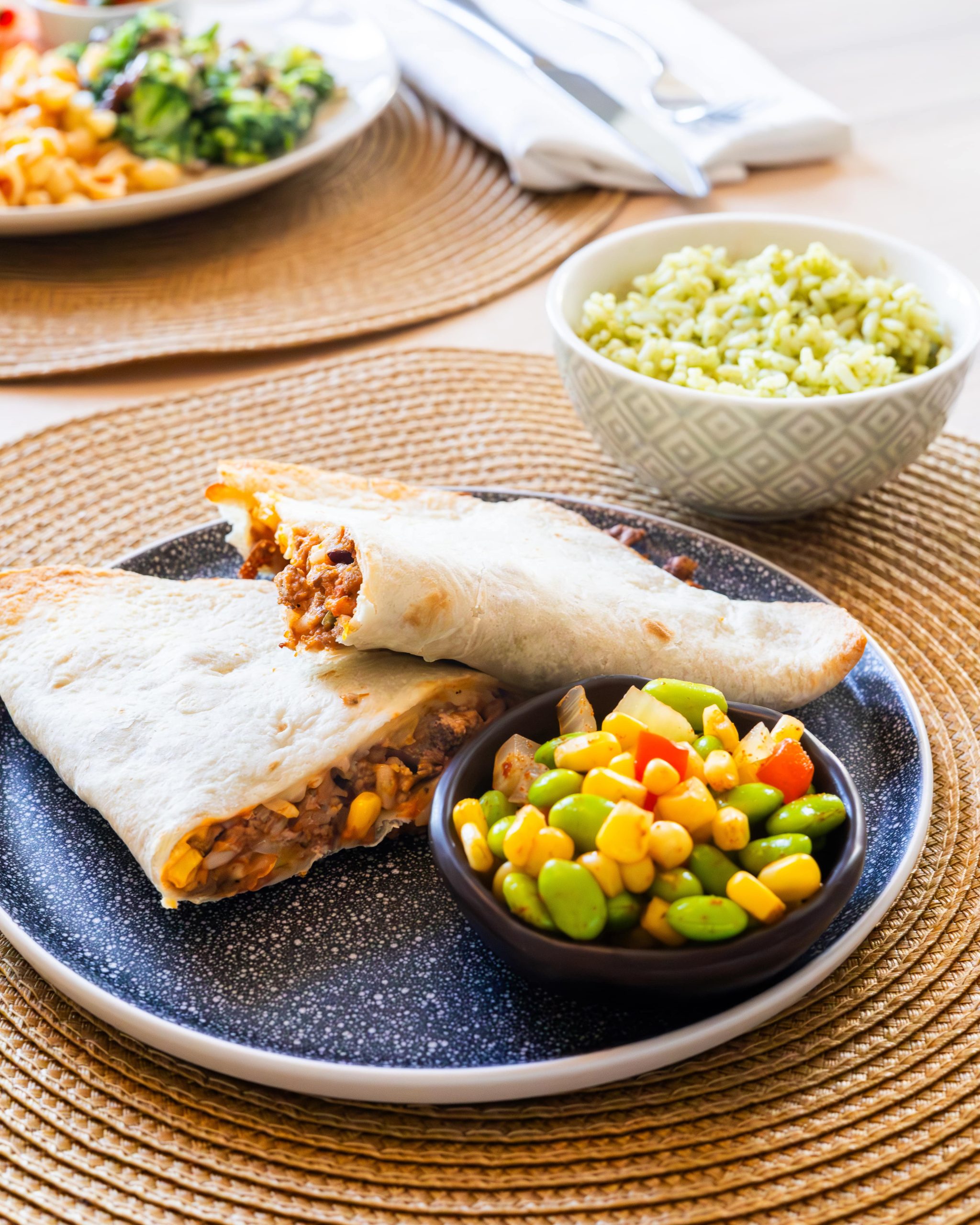 Tortillas, boeuf et porc hachés, fêves rouges, maïs, oignon, salsa, mozzarella, riz, cumin(Peut être congelé 3 mois)